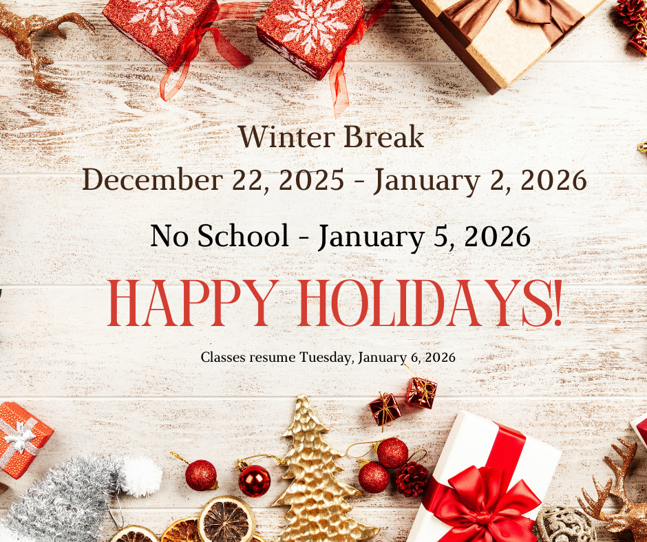 Reminder: There will be no school from December 22, 2025, through January 2, 2026 for Winter Break. No School: Monday, January 5, 2026Classes will resume on Tuesday, January 6, 2026